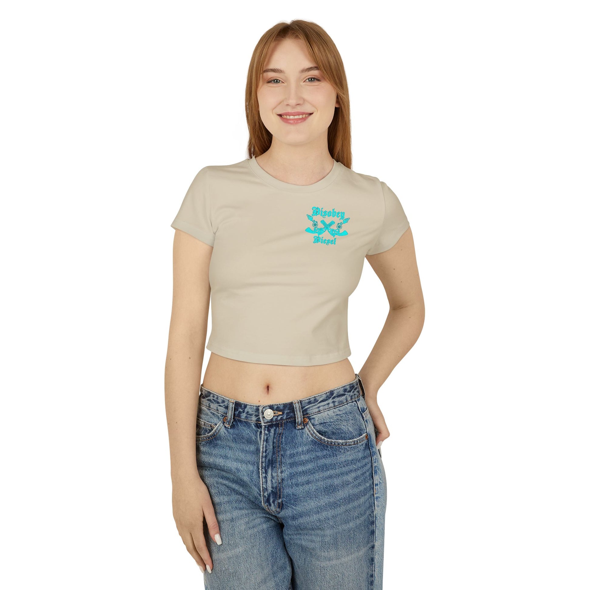 This women's baby tee is designed with a slim fit and mid-length cut, offering a flattering silhouette. Made from 100% organic cotton rib, it provides both comfort and sustainability, making it a versatile and stylish choice for everyday wear.